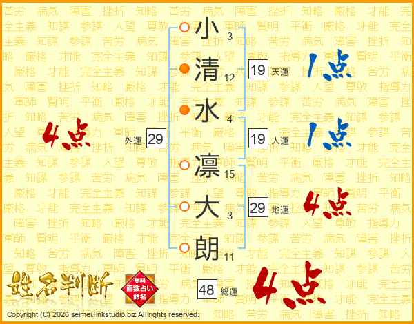 小(3画)清(12画)水(4画) 凛(15画)大(3画)朗(11画)