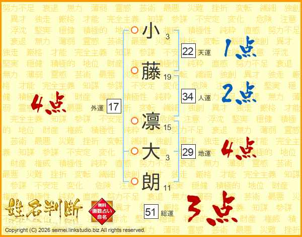 小(3画)藤(19画) 凛(15画)大(3画)朗(11画)