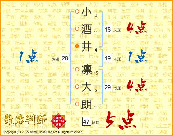 小(3画)酒(11画)井(4画) 凛(15画)大(3画)朗(11画)
