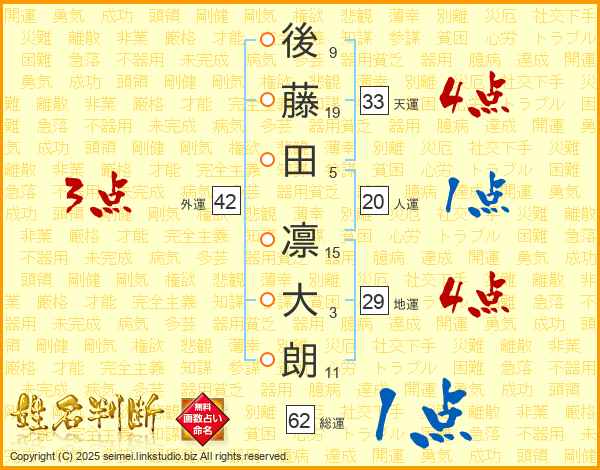 後(9画)藤(19画)田(5画) 凛(15画)大(3画)朗(11画)