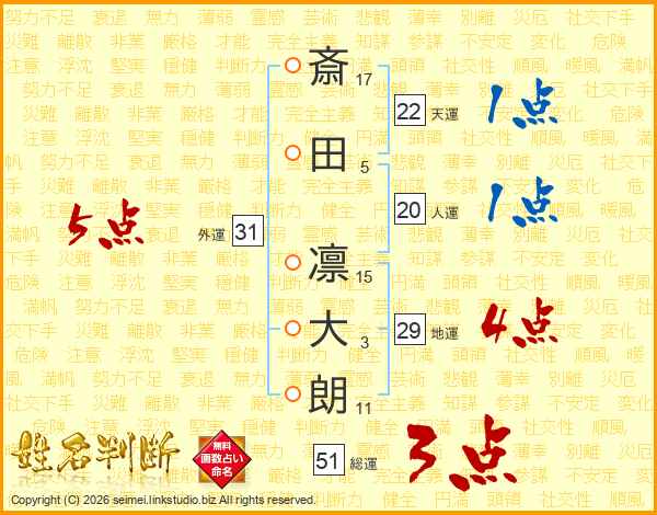 斎(17画)田(5画) 凛(15画)大(3画)朗(11画)