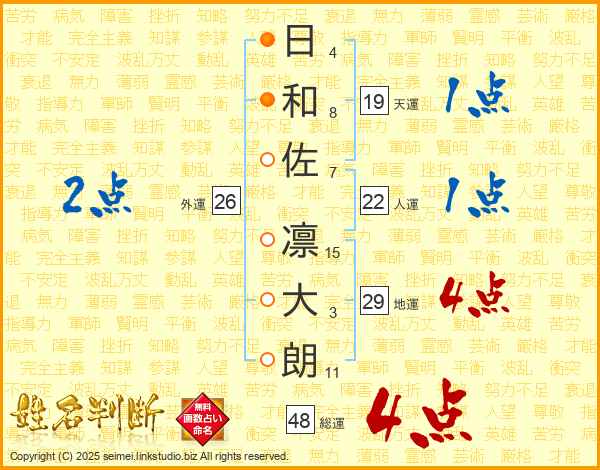 日(4画)和(8画)佐(7画) 凛(15画)大(3画)朗(11画)