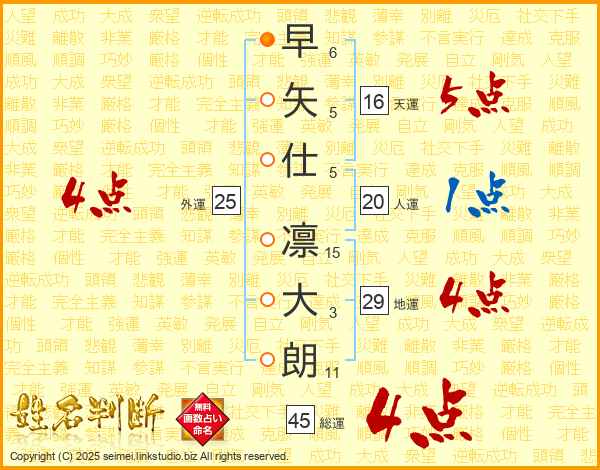 早(6画)矢(5画)仕(5画) 凛(15画)大(3画)朗(11画)