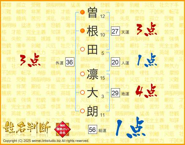 曽(12画)根(10画)田(5画) 凛(15画)大(3画)朗(11画)