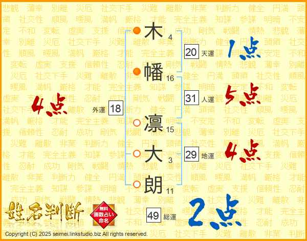 木(4画)幡(16画) 凛(15画)大(3画)朗(11画)