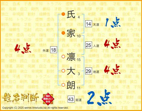 氏(4画)家(10画) 凛(15画)大(3画)朗(11画)