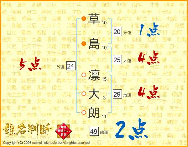 草(10画)島(10画) 凛(15画)大(3画)朗(11画)