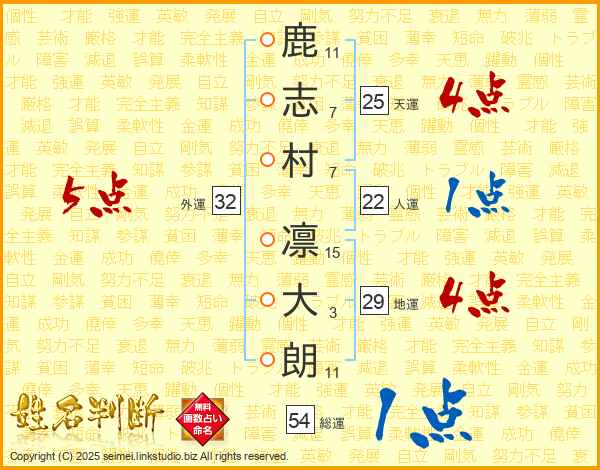 鹿(11画)志(7画)村(7画) 凛(15画)大(3画)朗(11画)