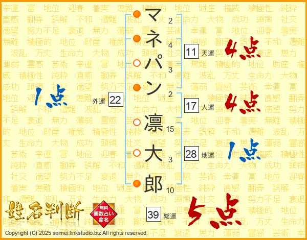 マ(2画)ネ(4画)パ(3画)ン(2画) 凛(15画)大(3画)郎(10画)