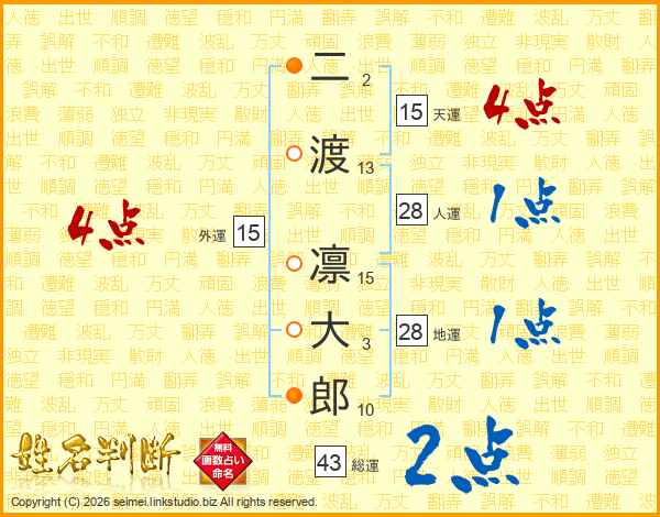 二(2画)渡(13画) 凛(15画)大(3画)郎(10画)