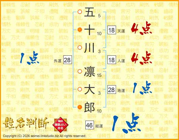五(5画)十(10画)川(3画) 凛(15画)大(3画)郎(10画)