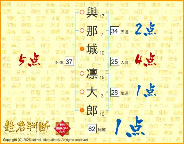 與(17画)那(7画)城(10画) 凛(15画)大(3画)郎(10画)