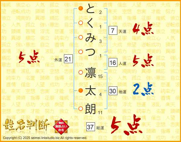 と(2画)く(1画)み(3画)つ(1画) 凛(15画)太(4画)朗(11画)