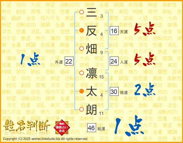 三(3画)反(4画)畑(9画) 凛(15画)太(4画)朗(11画)