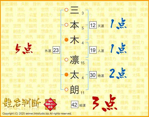 三(3画)本(5画)木(4画) 凛(15画)太(4画)朗(11画)