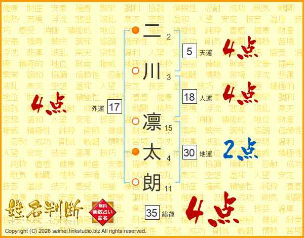 二(2画)川(3画) 凛(15画)太(4画)朗(11画)