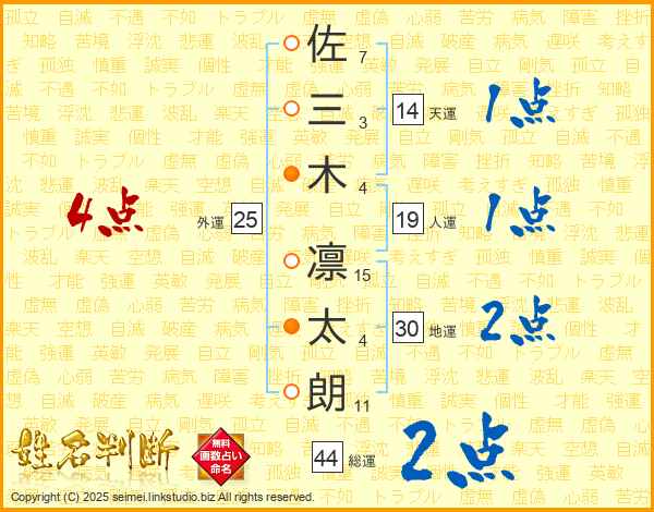 佐(7画)三(3画)木(4画) 凛(15画)太(4画)朗(11画)