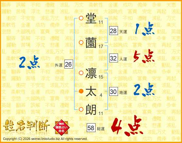 堂(11画)薗(17画) 凛(15画)太(4画)朗(11画)