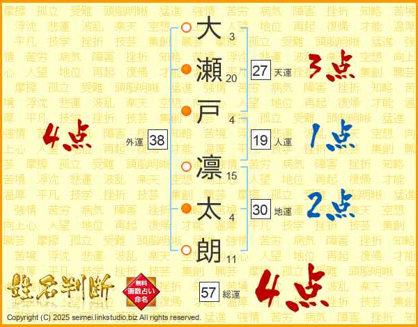 大(3画)瀬(20画)戸(4画) 凛(15画)太(4画)朗(11画)