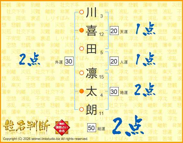 川(3画)喜(12画)田(5画) 凛(15画)太(4画)朗(11画)
