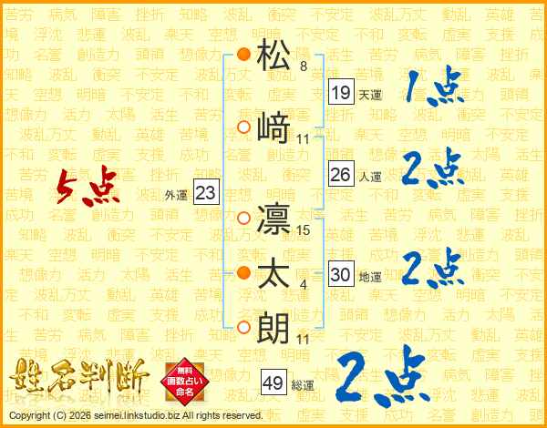 松(8画)﨑(11画) 凛(15画)太(4画)朗(11画)