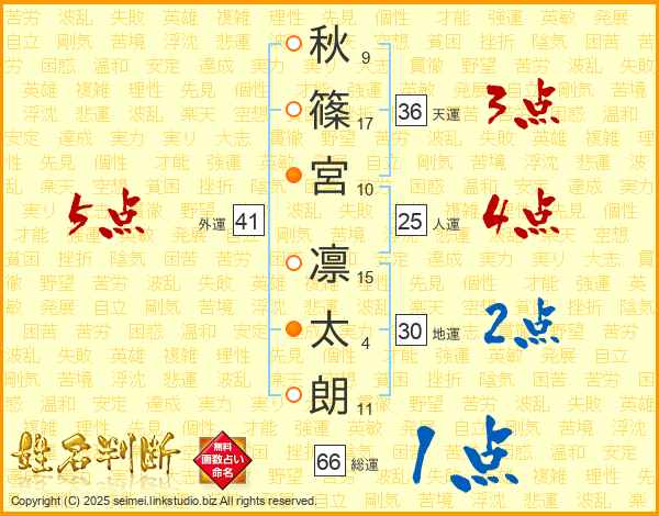 秋(9画)篠(17画)宮(10画) 凛(15画)太(4画)朗(11画)