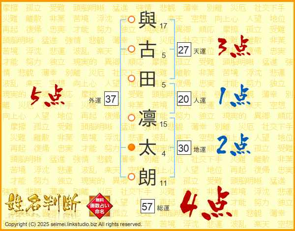 與(17画)古(5画)田(5画) 凛(15画)太(4画)朗(11画)