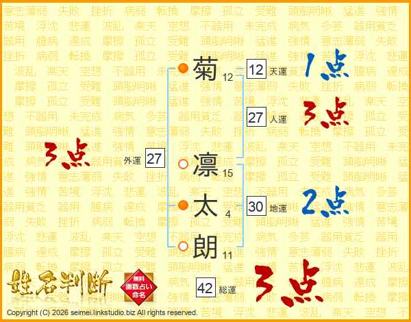 菊(12画) 凛(15画)太(4画)朗(11画)