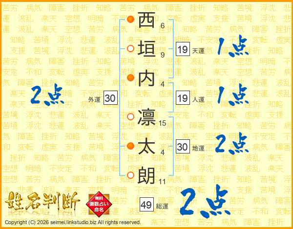 西(6画)垣(9画)内(4画) 凛(15画)太(4画)朗(11画)
