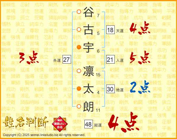 谷(7画)古(5画)宇(6画) 凛(15画)太(4画)朗(11画)