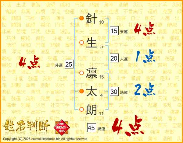 針(10画)生(5画) 凛(15画)太(4画)朗(11画)