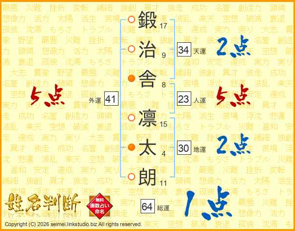 鍛(17画)治(9画)舎(8画) 凛(15画)太(4画)朗(11画)