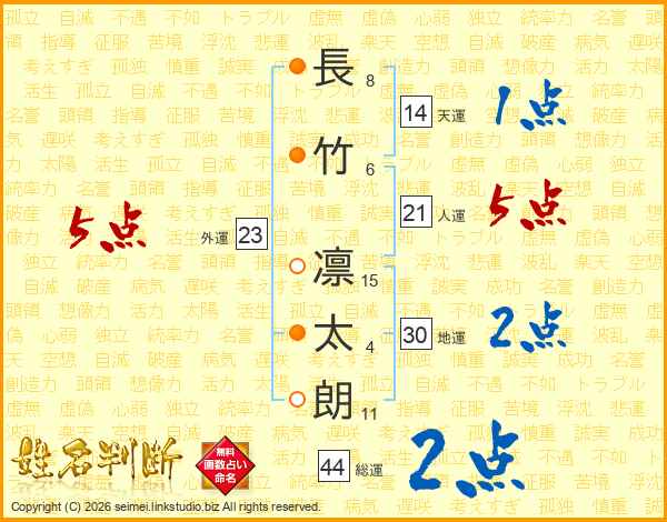 長(8画)竹(6画) 凛(15画)太(4画)朗(11画)