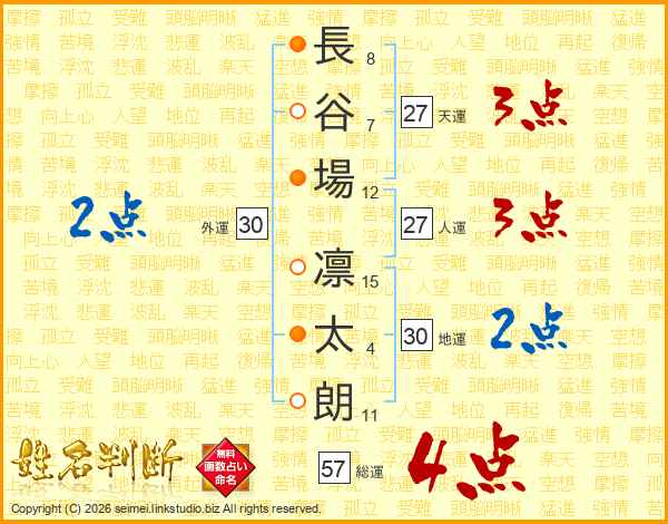 長(8画)谷(7画)場(12画) 凛(15画)太(4画)朗(11画)
