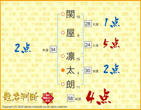 関(19画)屋(9画) 凛(15画)太(4画)朗(11画)