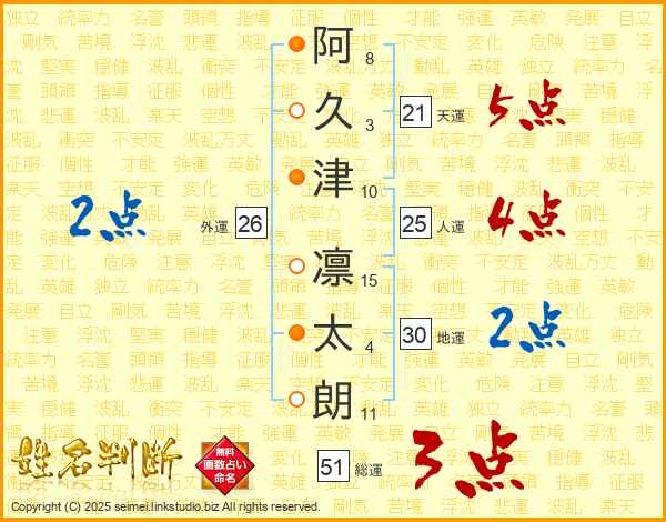 阿(8画)久(3画)津(10画) 凛(15画)太(4画)朗(11画)