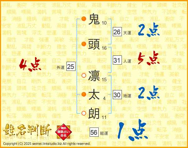 鬼(10画)頭(16画) 凛(15画)太(4画)朗(11画)