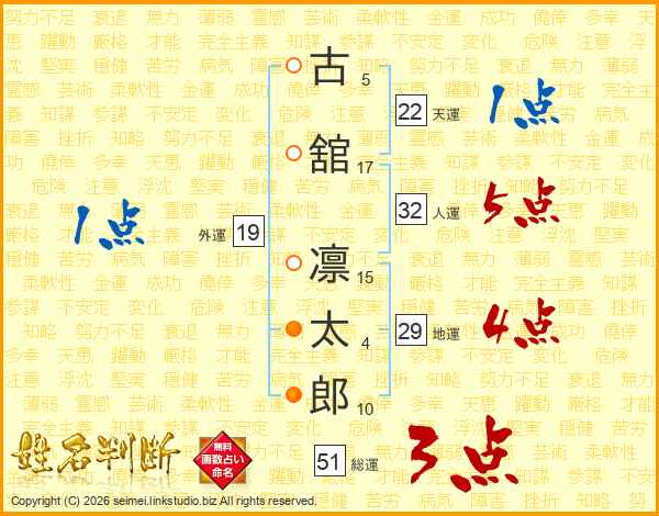 古(5画)舘(17画) 凛(15画)太(4画)郎(10画)