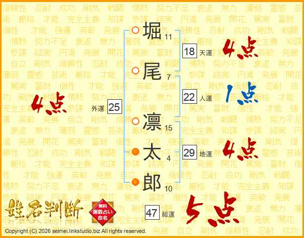 堀(11画)尾(7画) 凛(15画)太(4画)郎(10画)