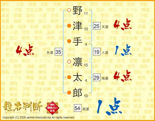 野(11画)津(10画)手(4画) 凛(15画)太(4画)郎(10画)
