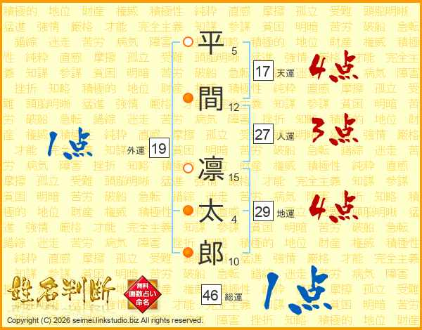 平(5画)間(12画) 凛(15画)太(4画)郎(10画)
