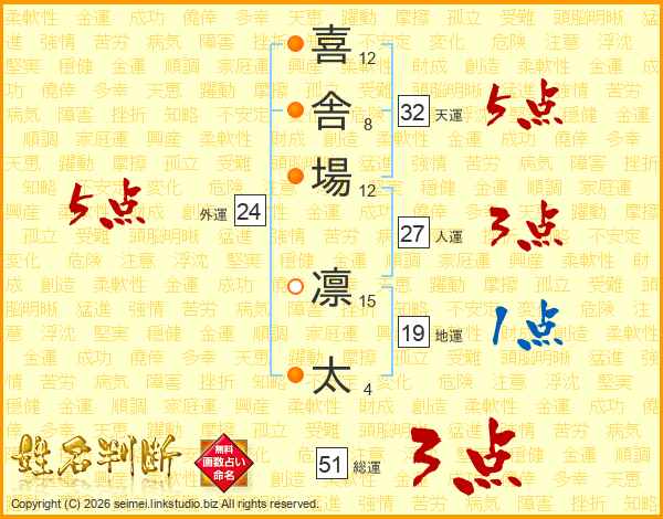 喜(12画)舎(8画)場(12画) 凛(15画)太(4画)