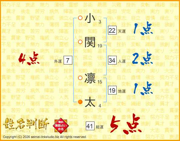 生活面を象徴する運勢です。外部から受ける影響力を表し、結婚運、家庭運や職場、環境への順応性を表します。総運から人運を引いた画数。姓や名が1文字の場合を除く。