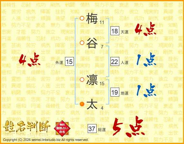 梅(11画)谷(7画) 凛(15画)太(4画)