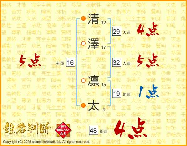 あなたの人生を表す1番重要な運勢です。生涯を通じて影響する総合運となり、主に50歳以降の晩年期に影響を及ぼします。苗字と名前の合計画数。