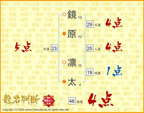 鏡(19画)原(10画) 凛(15画)太(4画)