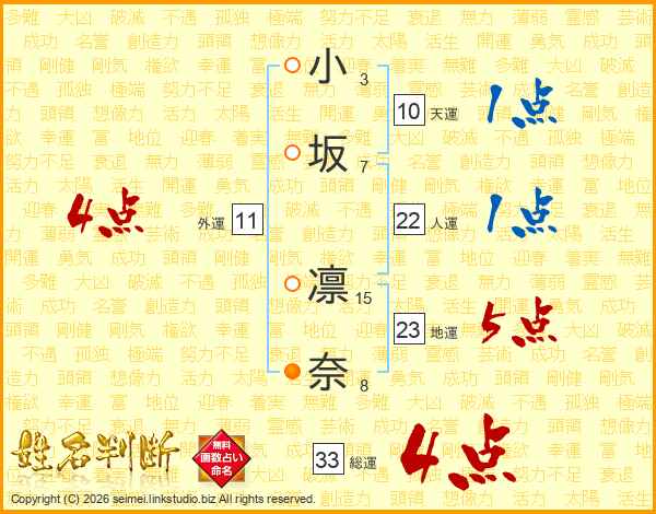小(3画)坂(7画) 凛(15画)奈(8画)