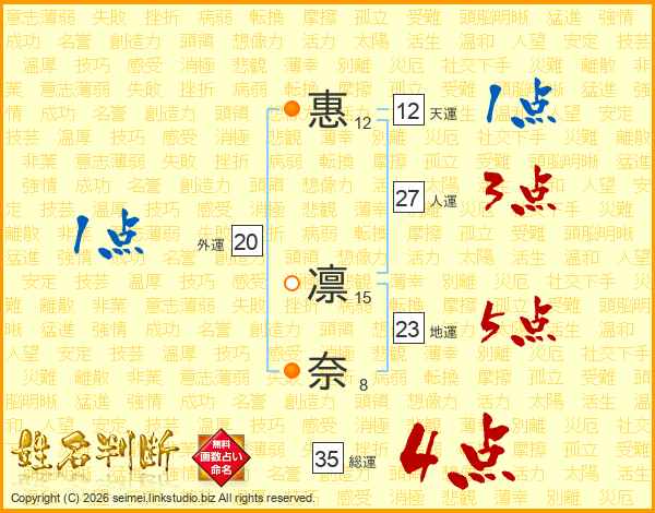 生活面を象徴する運勢です。外部から受ける影響力を表し、結婚運、家庭運や職場、環境への順応性を表します。総運から人運を引いた画数。姓や名が1文字の場合を除く。