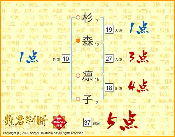 生活面を象徴する運勢です。外部から受ける影響力を表し、結婚運、家庭運や職場、環境への順応性を表します。総運から人運を引いた画数。姓や名が1文字の場合を除く。