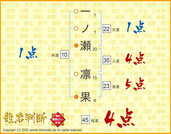 一(1画)ノ(1画)瀬(20画) 凛(15画)果(8画)